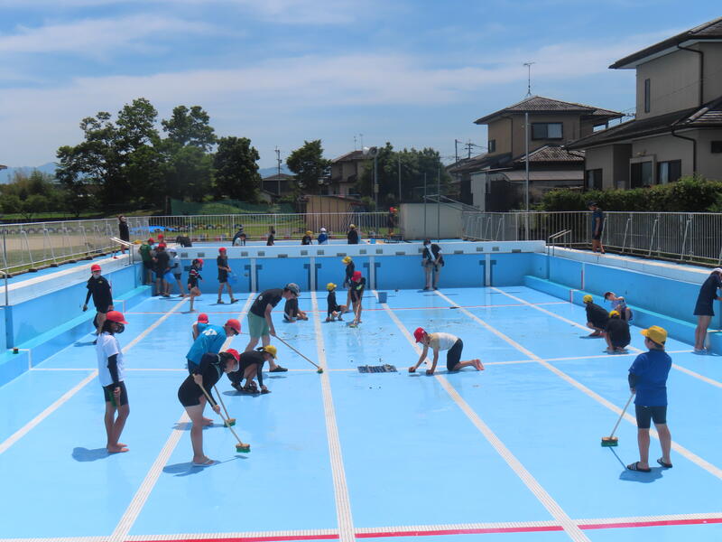 6月6日に、5年生と6年生でプール掃除を行いました。デッキブラシやモップを使って、プールサイドやプールの壁、床、トイレなどを掃除しました。掃除場所や役割は違っても、みんなで使うプールをきれいにするために、どの子供も一生懸命で、さわやかな汗を流しました。