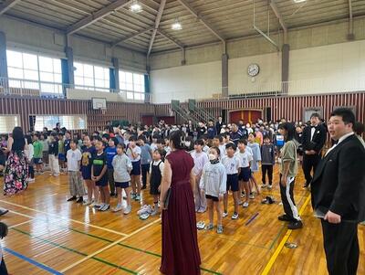 11月15日、新国立劇場合唱団の皆様21名が、東京から本校に来られました。司会者の軽快な進行のもと、日本の歌、世界の歌、オペラと多くの歌が体育館に響きました。最後は、校歌指導です。歌詞をイメージする指導が入ると、子供たちの歌が激変しました。自然豊かな風景が歌とともに、頭の中に入ってきました。そして、アンコールは、「勇気100%」でした。今日一番の盛り上がりで、ノリノリの合唱団と子供たちのコラボでした。終わってから、挨拶に行くと、「とっても素敵な子供さんたちですね。」「私たちの方が、元気をもらいました。」と話されました。「自慢の子供たちです。」と答えました。素敵な時間をありがとうございました。