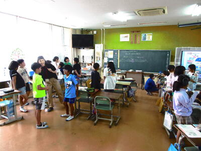 6月27日、4年1組で英語専科の先生とALTの2人で、英語の授業を行っていました。私も座って授業を受けました。めあては「もっと仲良くなるために、好きな時刻を伝え合おう」で、数字にamとpmをつけて言う練習でした。面白かったのは、「夜中の12時はamかpmか?」でした。私も「?」でしたが、「12:00am」が正解でした。その後、下の写真のように、「Wath time do you like?」→「I like 8:00pm.」→「Way?」→「it's bath time.」と英語を使って伝え合っていました。国際化が進む中、英語にたくさん触れている子供たちです。