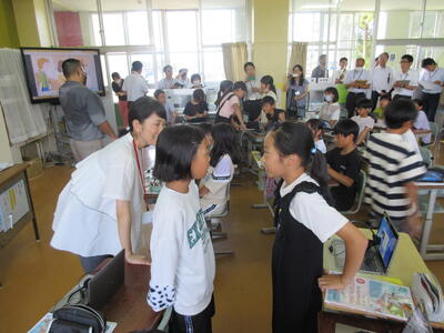 6月18日、英語授業づくりプロジェクトが行われ、人吉球磨の小中学校から約30名の先生方が5年1組の英語の授業を参観に来られました。勿論、本校の先生方も参観しました。授業力の育成は、教師のやりがいにもつながりますし、子供たちの学力向上にもつながります。だからこそ、私たちは、授業研究をするし、見て学ぶのです。先生たちも、子どもたちに負けず劣らず「元気と挑戦で成長を」です。とても素敵な授業でした。リズムとテンポがあり、自分のことを英語で相手に伝える場面がたくさんありました。つまり、多くの言語活動(話す・聞く・読む・書く)があり、一人一人の子供の成長をしっかりと感じる授業でした。