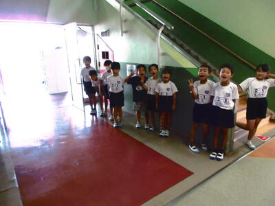 9月12日、朝7時50分ごろ、校舎内から「おはようございます。」という元気な声が聞こえてきました。声の方へ行ってみると、児童用玄関入口で、2年1組の子供たちが「廊下でのあいさつ運動」を行っていました。