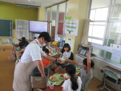 給食の残菜が激減です。その理由はいくつかあると思いますが、その1つを本校の給食担当の先生から教えたもらいました。それが「一口協力」です。早速、その様子を5年1組に参観に行きました。当番が給食を配った後、個人での量の増減をします。その後、もし残ったならば、写真のように担任の先生が、食器缶を抱えて、「一口協力」してくれる子供に、ついで回るのです。クラスでやり方はいろいろあると思いますが、全学級で全員の先生方が、「一口協力」等の食育指導をされていることが、残菜激減の大きな理由です。私の箸に書かれている言葉が、「食は体をつくる」です。子供たちも、私たち大人も、食でも「元気力」を高めていきたいものです。