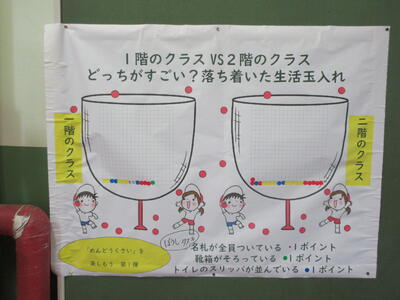 4月22日、朝の8時05頃、5・6年生の皆さんが、教室や靴箱を回っていました。「何をしているの?」と尋ねると、「人権委員会で『落ち着いた生活玉入れ』のチェックをしています。」とのことでいした。名札着用、靴箱の並び方、トイレのスリッパの並び方をチェックしていました。「『めんどくさい』を楽しもう」が、今年の合い言葉です。素敵な合い言葉です。
