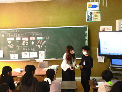 1月30日、1時間目から6時間目まで、多目的室で、すべての学年が、担任と栄養教諭による「食育の授業」を行いました。下の写真は、5年生の食育の授業で、栄養教諭の先生が1日に必要な野菜を持参されて、子供たちに何グラムかを予想させている場面です。子供たちは「20g」等の少ない予想をしていましたが、300g必要だということを聞いて、驚いていました。給食ではその中の半分(約150g)を使って調理されているそうです。残り半分(150g)は、ご家庭で料理に是非取り入れてください。「食は体を作る」です。よろしくお願いします。