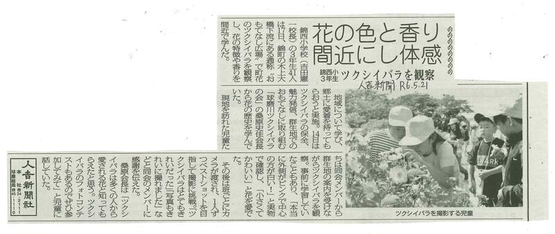 5月21日の人吉新聞に「花の色と香り間近にし体感」という記事が掲載されました。「ふるさと学習」の一環として3年生が町花である「ツクシイバラ」の群生地に行き、観察し体感した様子が書かれています。すごくいい匂いがしたそうです。