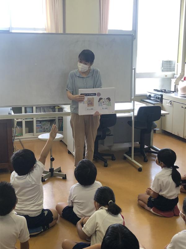 今週は身長と体重の測定をした後、養護教諭による保健指導が行われています。指導内容は、「コロナウイルスの感染を防ぐためにできる大切なこと」です。
