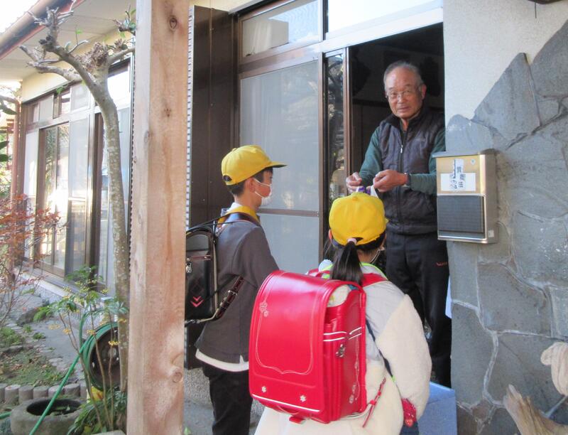 子どもたちは、登校班ごとに宅配する場所を分担して訪問しました。