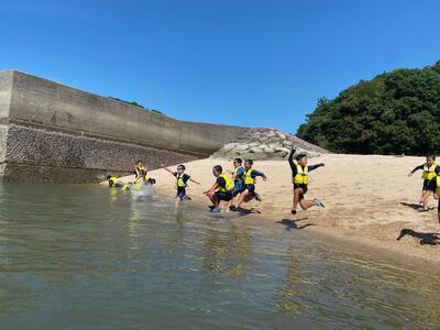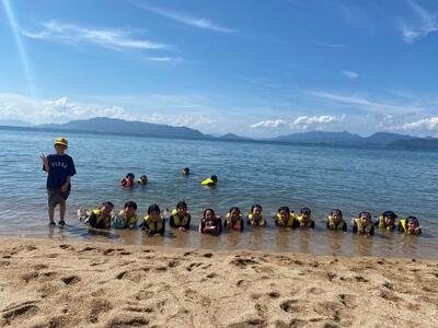 9月19日、最終日(3日目)の午後、最後の活動が、海水浴でした。お盆を1カ月過ぎていますが、クラゲは見当たらず、海に入ることができました。ライフジャケットを着ているので、子供たちは大胆でした。50m先まで泳いで行ったり、海に全速力で走ってきて飛び込んだり、海辺でマーメードポーズをしたりと精いっぱい海を楽しみました。