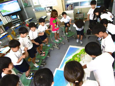 10月1日、1年1組で国語「くじらぐも」の研究授業を行いました。めあては「くじら雲に飛び乗った子供たちの気持ちを考えよう」です。挿絵や文章から気持ちを書かせて発表させました。たくさん発表しました。その後、メインの動作化です。教室後方に椅子を丸く並べて、掛け声とともに椅子に飛び乗った子供たち。下には、街の景色が見えます。ある子供が「本当に飛んでいるみたい。」とつぶやきました。ある子供が「歌を歌おう」と言いました。みんなでトトロの「散歩」を歌い始めた子供たちでした。物語にどっぷりと浸った子供たちの顔は素敵な笑顔でした。