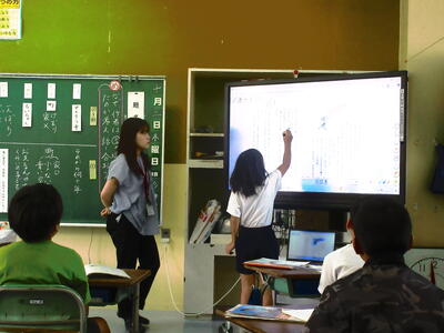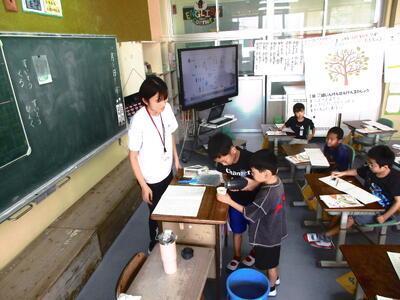 10月14日、ひまわり1学級で、国語の研究授業を行いました。子供は5人ですが、3つの学習内容を同時に行っていくので、「わたり」の指導方法が必要となる授業です。2年生は、電子黒板を活用して、自分たちで漢字の学習を進めていました。その姿に感心しました。1年生の3人は、学ぶ意欲が大きく成長していて、しっかりと集中して取り組んでいました。最後は、2年生が1年生におもちゃランドのおもちゃの遊び方を説明して、一緒に遊びました。まさに「1日1ミリ」。確実に成長している子供たちです。このひまわり1学級には、担任の先生以外に支援員の先生も毎時間入って学習支援をしています。担任にとっても子供たちにとっても大変プラスになっています。