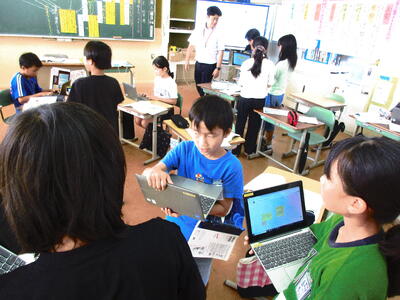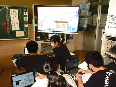 10月3日、6年2組で国語「やまなし」の研究授業を行いました。主発問は「筆者は『やまなし』を題名としたが、あなたは作品の題名として『やまなし』と『かわせみ』どちらが良いか。」でした。とても提案性の高い授業でした。1つは「根拠と理由で納得UP」で、もう1つは「タブレットでの共有」でした。子供たちは、「やまなし」と「かわせみ」に立場を決めて、根拠と理由を明確にタブレットに打ち込みながら、自分の考えを高めていました。特に3つ目の視点「作者から」に、根拠と理由を書いていた子供は、私が読んでも「なるほど」と納得する考えを書いていました。さらに、タブレットで他の友達の考えを見ながら、自分の考えに生かしたり、友達に質問等に行ったりする場面もありました。今後、このような授業の積み重ねにより、思考の深化と共有が益々進んでいくと感じました。