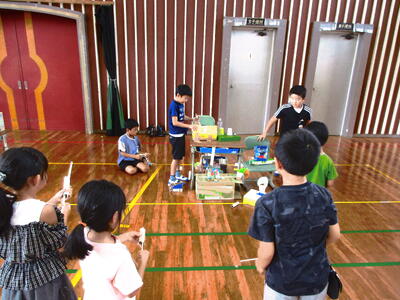 10月10日、2年生が1年生を招待して「おもちゃランド」を体育館で開きました。「校長先生、こっちに来て、魚釣りしてください。100点の魚もいますよ。」お店を開いている2年生の顔が生き生きしています。もちろん、お客さんの1年生は、それ以上の笑顔です。体育館には10種類のお店が開店しており、各お店には3~4人の店員さんが接客していました。2年生の生活科の学習で、「他の人に楽しんでもらう」「おもちゃを作る」「紹介や説明の練習をする」「お客とコミュニケーションをとる」等、どれも本番に向けて2年生が積み重ねてきた学びです。おもちゃランドは大成功でした。おくんち祭りにも引けを取らない熱気で、まさに「お祭りだ~!」でした。