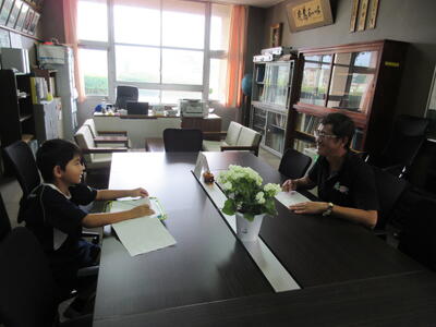 9月10日、4年生の計3名(1名と2名)が、国語の学習「新聞を作ろう」の情報収集としてインタビューに校長室にやってきました。たくさんの質問をして、メモをして帰りました。例えば、「今、はまっていることは何ですか?」の質問には、次の2つを答えました。「朝から片手卵割り」「朝起きてすぐの気温当て」ほぼ毎日行っている2つです。どんな新聞ができるか楽しみです。まさに「体験こそよき学び」です。