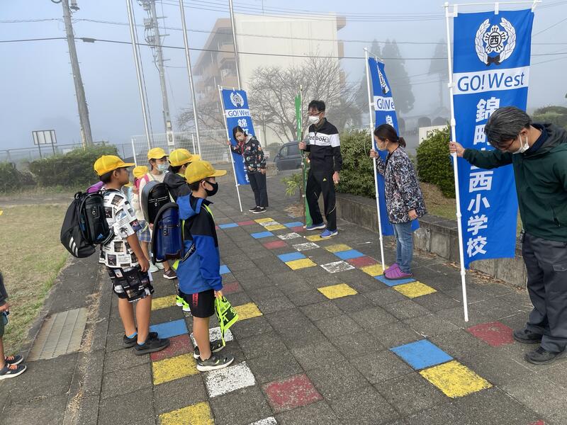 生活安全委員会の保護者と職員で学校や校区の危険箇所に立ち、登校中の子供たちと挨拶を交わしました。