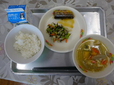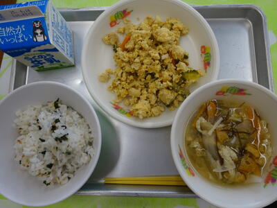 わかめごはん、はくさいのみそしる、ごもくきんぴら