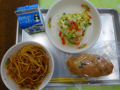 しょくぱん、なすのトマトスパゲティー、ツナとコーンのサラダ