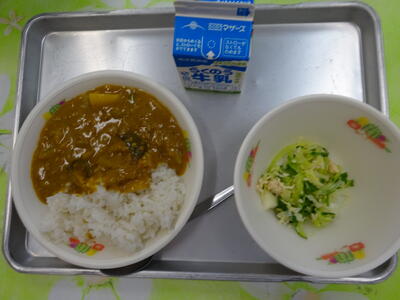 むぎごはん、あきのフルーツカレー、かいそうサラダ