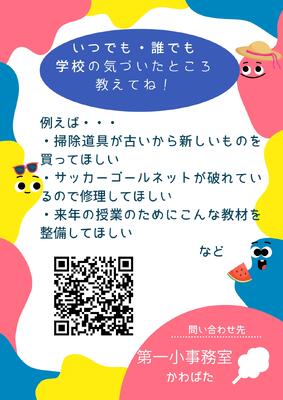 学校で使う備品や消耗品の購入に関することや学校の施設の修繕に関することは事務職員が管理しています。現在本校の事務室では子どもはもちろん、保護者、地域の方からも広く要望や意見を集めています。何かありましたがQRコードからご意見をお寄せ下さい。