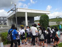 その後、追悼記念館に移動し、語り部の八木道子さんのお話を聞きました。道子さんからは「平和のバトンを今日みなさんに渡します。次の誰かに必ず引き継いでください」との言葉がありました。その思いを胸に追悼記念館ホールで立派に「平和宣言」を行い、みんなで折った千羽鶴を供えました。