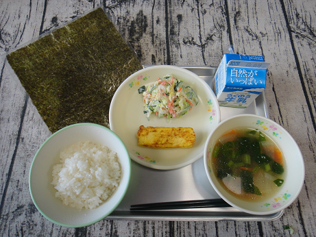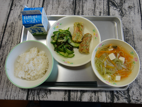 麦ご飯 いぐさそうめん汁 ちくわの磯辺揚げ しょうがこんぶ