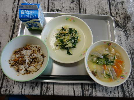 うまじゃこごはん 団子汁 小松菜のおかかあえ 牛乳