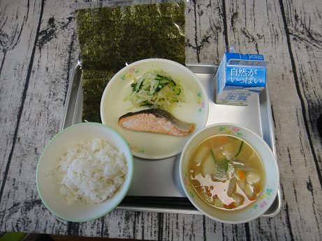 セルフおにぎり 味噌汁 鮭 たくわんあえ 牛乳
