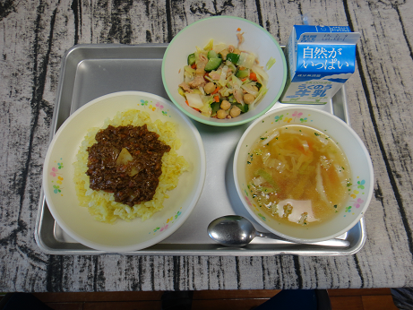 ドライカレー コンソメスープ ひよこ豆のサラダ 牛乳
