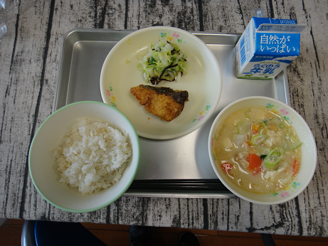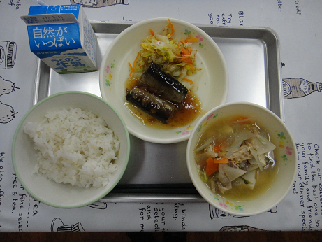 麦ご飯 いわしの梅煮 豚汁 白菜の甘酢 牛乳