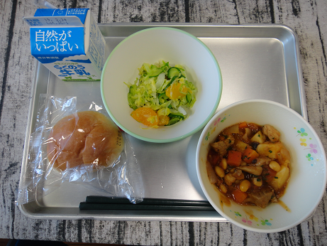 テーブルロール ポークビーンズ みかんサラダ 牛乳
