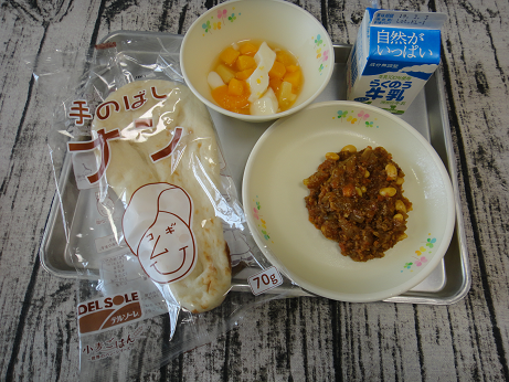 メインは、大人気のセルフバーガーです。切り目の入ったパンに野菜と魚のフライをはさんで食べます。タルタルソース付きです。いつも以上に、手洗いと消毒を念入りにして、おいしくいただきました(^o^)