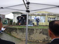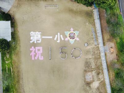本日は朝から雨がパラパラちらつく天候でしたが、予定通り開校150周年記念ドローン写真撮影できました。本日は、学校の児童職員だけでなく、保護者・地域の方も多数おいでいただきドローンによる人文字の写真撮影ができました。(教頭 米澤)