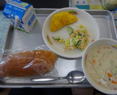 ミルクパン、クラムチャウダー、トマトオムレツ、アーモンドサラダ