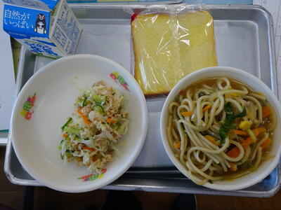 こめこいりにんじんパン、たらこうどん、ゴーヤーチップス