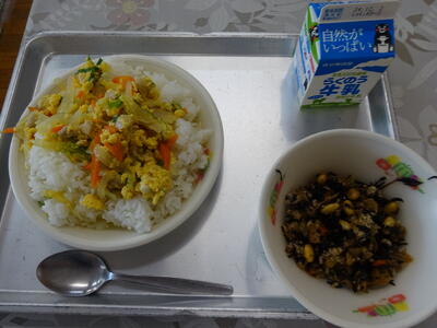 わかめごはん、もずくのみそしる、ゴーヤーチャンプルー