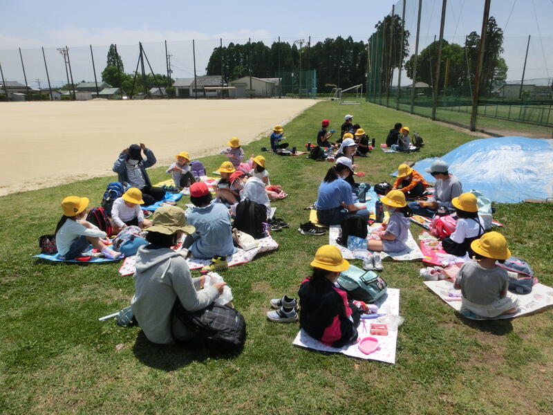 好天に恵まれ、校庭で食事する子供たちも