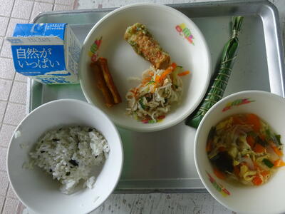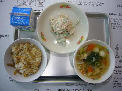 わかめごはん、わかたけじる、きりぼしだいこんのサラダ、ちくわの2色揚げちまき