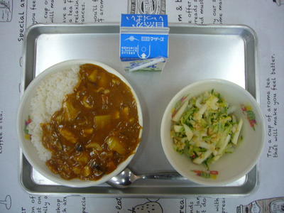 もりのきのこカレー 白菜とリンゴのサラダ 牛乳