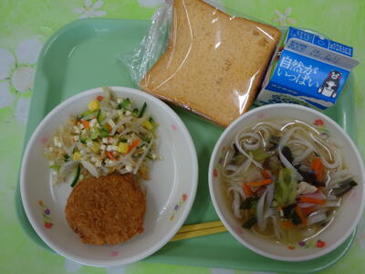 トマトパン、ひらめんスープ、アーモンドサラダ、うまかコロッケ