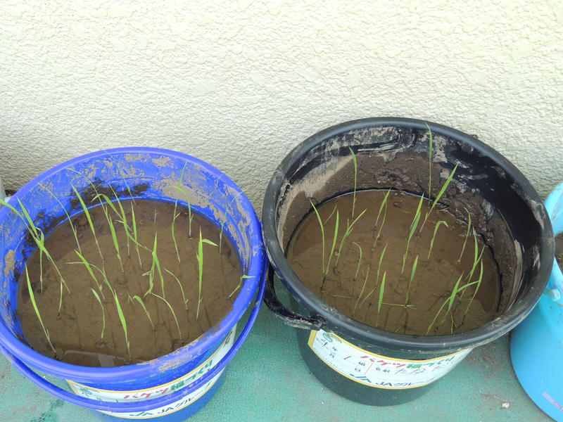 ↓ 3,4年生が総合的な学習の時間で取り組んでいる『バケツ稲』です。ぐんぐん生長しています。