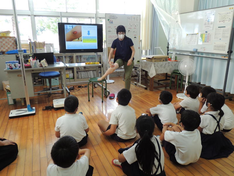 今日から各学年毎に身体測定が行われます。併せて辻養護教諭が保健指導を行います。今回のテーマは『けがをふせごう~自分でできるけがの手当を覚えよう~』です。まずはけがの予防を学習し、もしけがをしてしまったときの応急処置を学習しました。