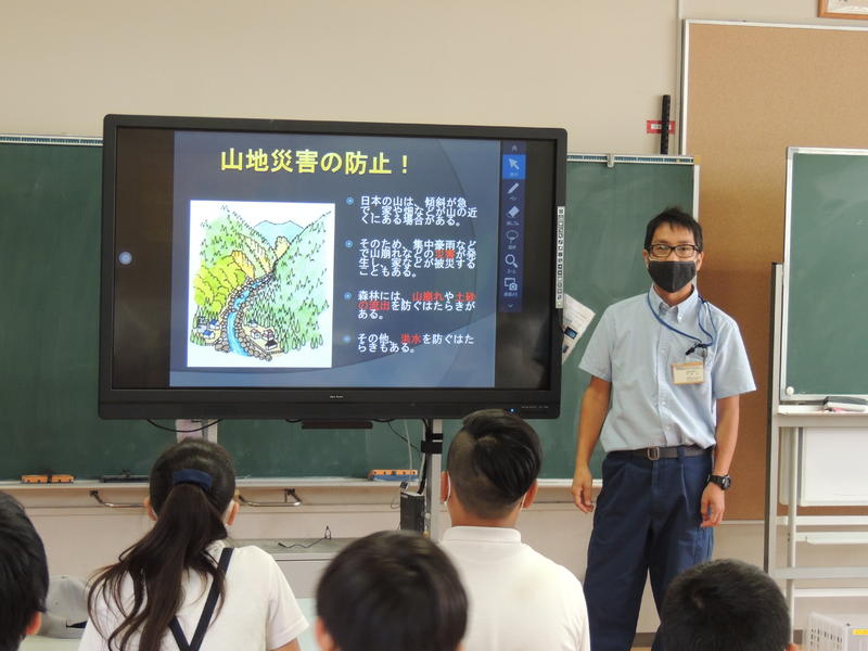 6年生は3時間目と4時間目に「森林環境学習」を行いました。まず、3時間目は菊池森林組合の宮崎先生から森林の役割などを教えて頂きました。熊本県の面積に占める森林の割合などのクイズなどもあり楽しく学ぶことができました。