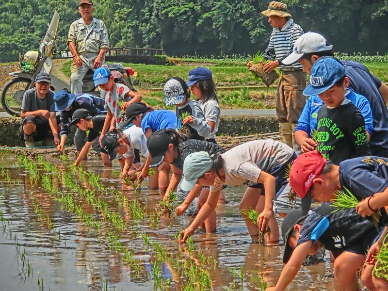 しかし、ぬかるんだ田んぼはさすがに歩きにくいのか、中には転んでしまう子供も。田植えの後は、地域の方にしっかり体を洗ってもらっていました。