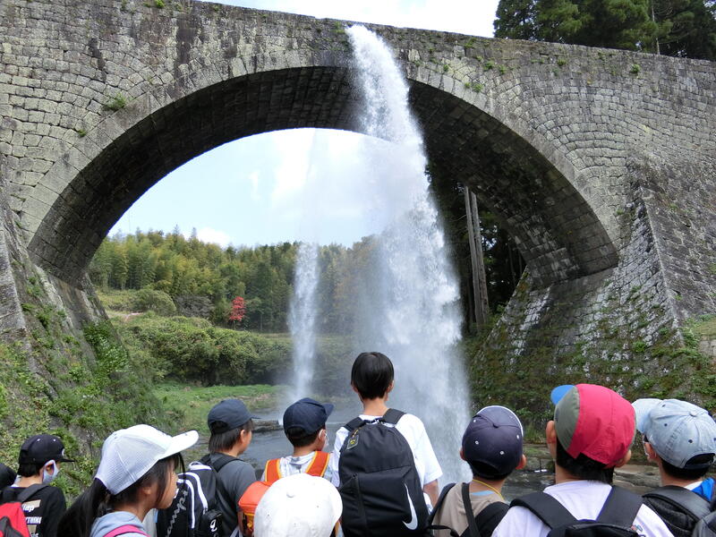 まずは通潤橋での学習です。資料館で詳しく説明をしていただき、その後実際に通潤橋の上から見学をしました。最後の放水では通潤橋の大きさやその偉大さに感動しました。