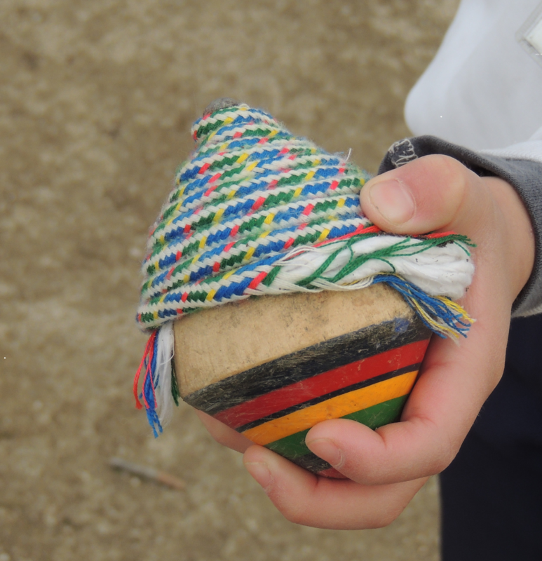1年生が生活科の学習で12月のたこあげに続いて「こままわし」にチャレンジしました。