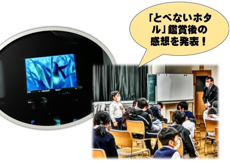 人権擁護員さんの役割についてのお話や第一小クイズ、「とべないホタル」の上映などがありました。