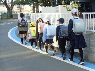 狭い路側帯となっていますが、多くの子どもたちが車道に出ないように心がけて歩いています。