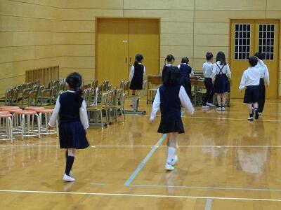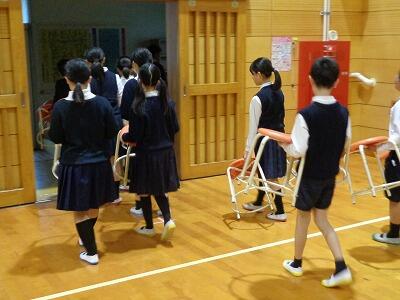 体育館へ行くと、登校後の新6年生が、入学式の為に体育館に入れていた保護者用イス等をテキパキと運んでいました。