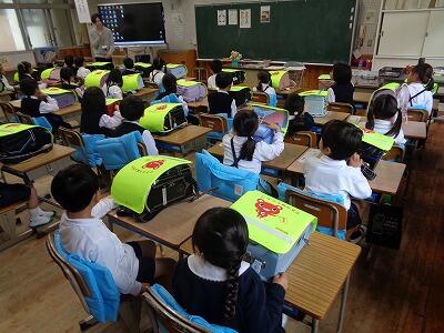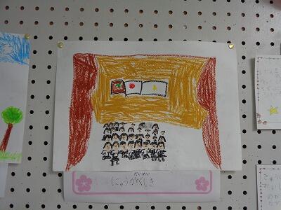 新1年生の教室では、掲示板に新2年生が描いた学校行事等の絵が飾ってありました。また、1年生の初めての授業は、「話の聞き方」「ランドセルからの教科書類の出し方・教科書類の引き出しへの入れ方」「連絡帳の出し方」「休み時間の過ごし方」等々でした。これから少しずつ学校での生活の仕方を学んでいきます。