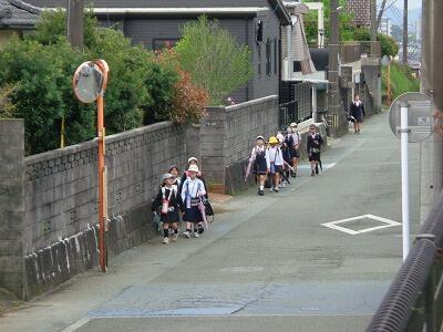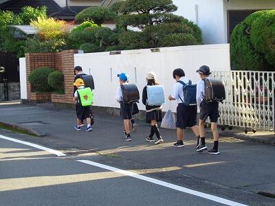 登校の様子を見ていましたが、徒歩で登校している1年生が路側帯からはみ出して歩いていました。そこで、上級生に「道路の歩き方を教えてあげて。」と頼みました。すると、やさしく安全な道路の歩き方や横断の仕方を教えていました。頼りになる上級生たちです。