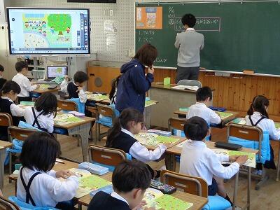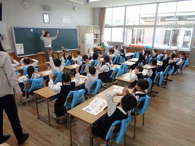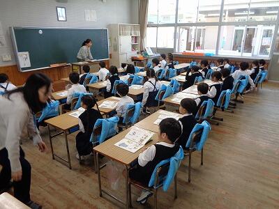 始業後の1年生の教室では、話を聞く時の姿勢、発表する時の声の大きさ・お隣の友達と話し合う時の声の大きさについて学んでいました。これらは、授業を受けるうえでの基本となります。また、別の学級では算数を算数ブロックを使っての勉強をしていました。